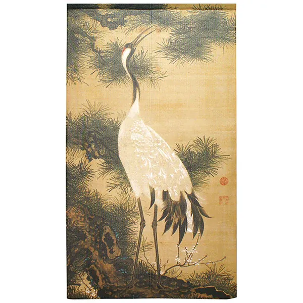 Ce noren représente des Grue Blanche avec Pin, une des œuvres plus populaires de l’artiste Ito Jakuchu.